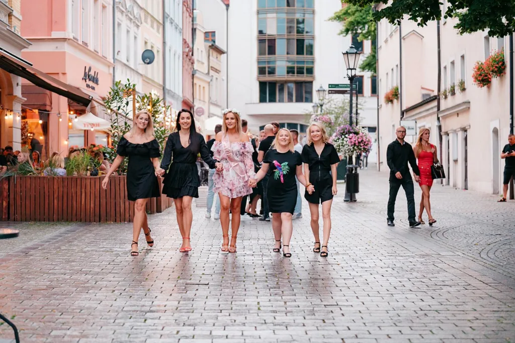 Sesja rozpoczęła się na deptaku, który tego wieczoru tętnił życiem. Ciepłe światło, śmiech przechodniów i kobieca energia – wszystko idealnie zgrało się z atmosferą tej wyjątkowej chwili. Dziewczyny pojawiły się w dopasowanych stylizacjach, z balonami, wiankami i nieodłącznym Prosecco w dłoni. Każdy kadr był pełen autentycznych emocji.